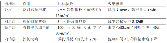 双层墙+50mm空腔:隔声量提升至35-40dB(110dB→70-75dB),空腔填充吸音棉可再增5dB。