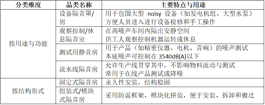 工业隔音房(静音房)种类较多,根据不同的应用场景和功能特点,主要可以从用途功能和结构形式两个维度来划分。