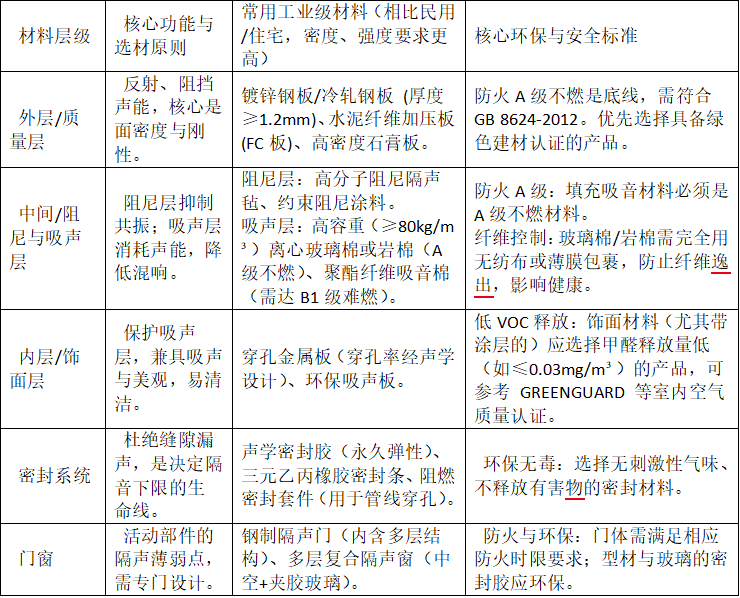 工业隔音房(静音房)材料的选择与环保标准,需要围绕“高性能、高安全、低影响”这一核心。整个决策是一个平衡隔音性能、防火安全与环保健康的系统工程,具体如下: