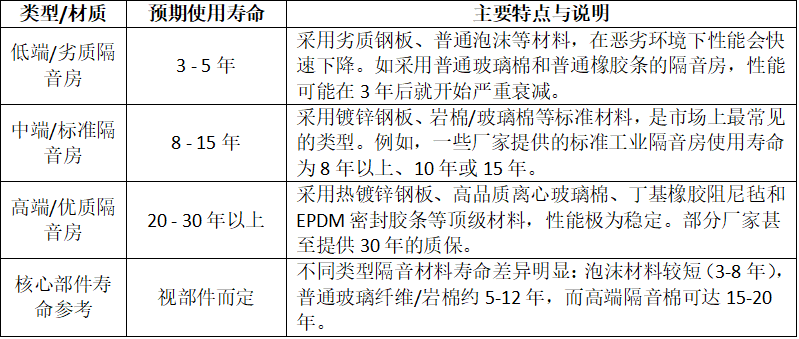 不同隔音房的使用寿命概览