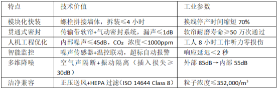 流水线隔音房是工业降噪中的高技术集成产品,其设计需在高效隔音、产线适配、操作便捷三者间取得平衡。以下是核心特点与设计要点的系统性解析,附工业级参数及案例: